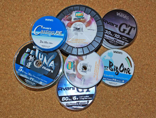 Il solito Avani GT PE6, il factotum del tropico tranquillo, lancia in orbita e resiste bene anche ai maltrattamenti, almeno nell'esperienza mia; il fratellone PE10 per fare le mie prove matte; l'Avani Tuna perchè non l'ho mai provato ma sembra molto molto bello e perchè ci sta bene sullo Stella 8000 abbinato alla Offblow tuna; il fins da 80, sovratesta un po' ma è perfetto per jiggare duro e pesante; il Varivas Bigone PE4, multicolor e sottile, per jiggare light e con corrente senza dover caricare sempre due etti di jig; e poi gli sfizietti in pesca leggera da relax, Varivas casting 38 libbre e fins 30 libbre.... poi c'è qualche bobina già piena con del Fins 60 libbre, diametro spettacolare tra gli americani e che già mi ha dato molte soddisfazioni, e dello "strano" varivas colorato ad ogni metro da 50 libbre....
